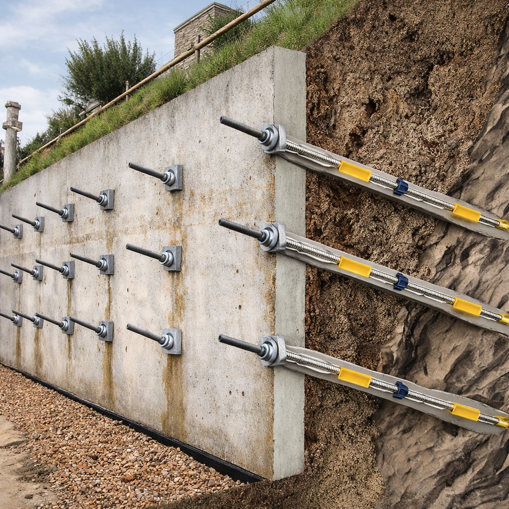 Буроинъекционные анкера — это передовые конструктивные элементы для укрепления откосов, стабилизации склонов, фиксации подпорных стен и обеспечения устойчивости сооружений в любых, даже самых сложных, геологических условиях. Система создается путем бурения скважины, установки арматурного стержня и последующего инъецирования цементного раствора, что гарантирует высокую несущую способность и долговечность конструкции.